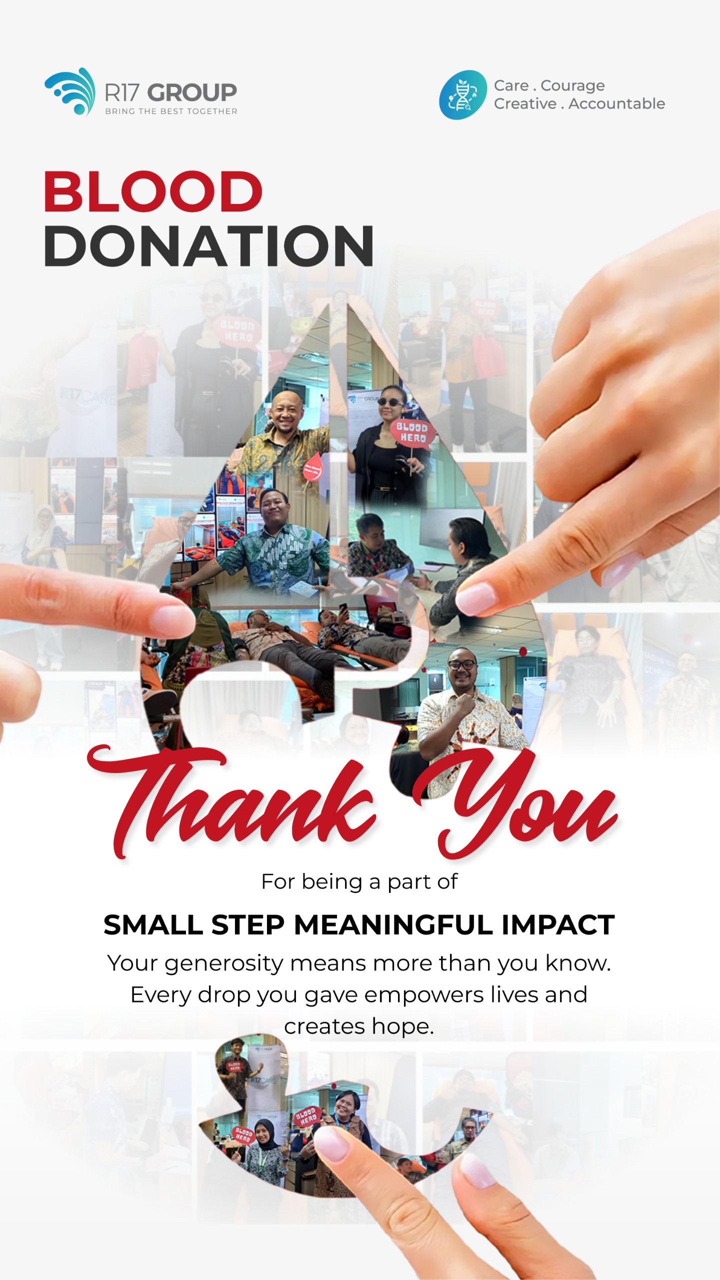 Kepedulian terhadap sesama menjadi salah satu nilai utama yang terus dijaga oleh R17 Group. Sebagai bentuk implementasi nyata dari nilai Care, R17 Group kembali menyelenggarakan kegiatan Donor Darah, sebuah program sosial yang telah menjadi agenda rutin setiap tiga bulan sekali. Melalui kegiatan ini, R17 Group berupaya menumbuhkan semangat berbagi dan empati di antara seluruh karyawan serta masyarakat sekitar. Kegiatan ini sukses dilaksanakan di kantor pusat R17 Group, 18 Parc Place Tower D, dan diikuti oleh para karyawan serta masyarakat sekitar yang dengan antusias turut menjadi bagian dari aksi kemanusiaan tersebut.